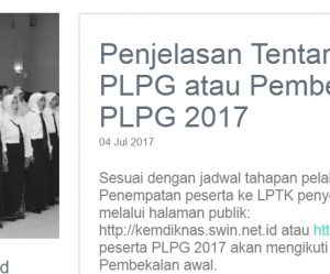 Sesuai dengan jadwal tahapan pelaksanaan PLPG 2017 maka Penempatan peserta ke LPTK penyelenggara diinformasikan melalui halaman publik: http://kemdiknas.swin.net.id atau http://ap2sg.sertifikasiguru.id selanjutnya peserta PLPG 2017 akan mengikuti tahapan Pra Kondisi atau Pembekalan awal.